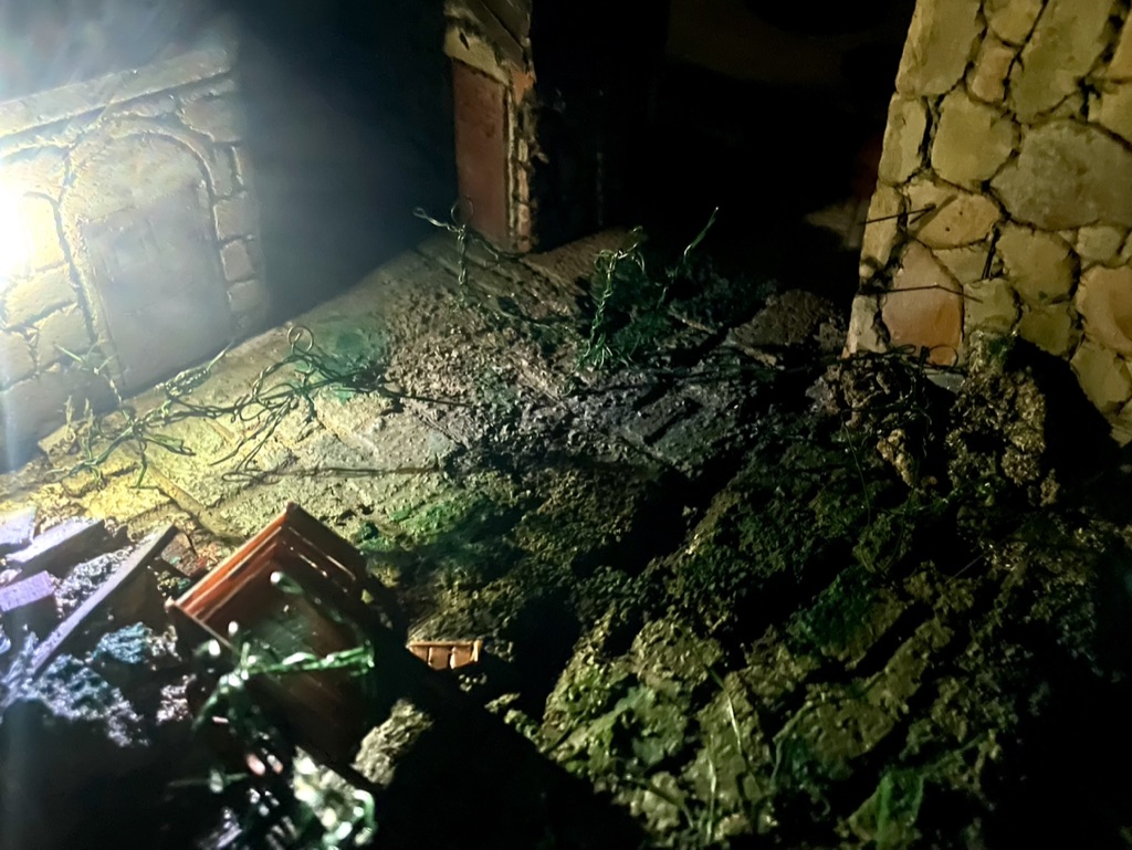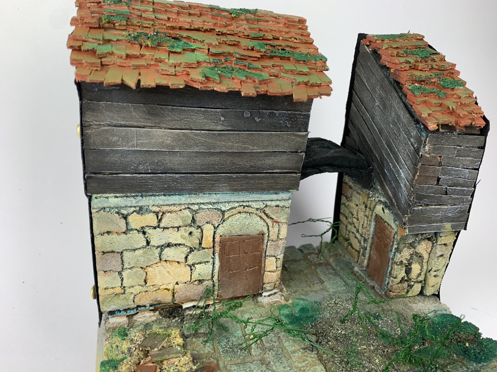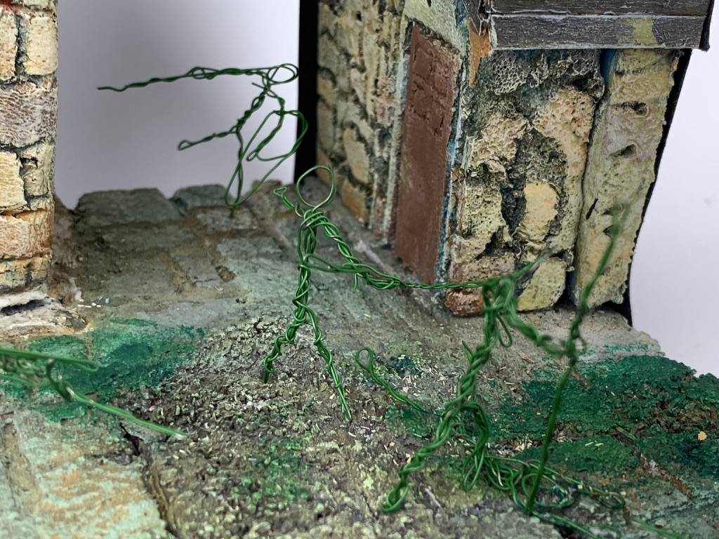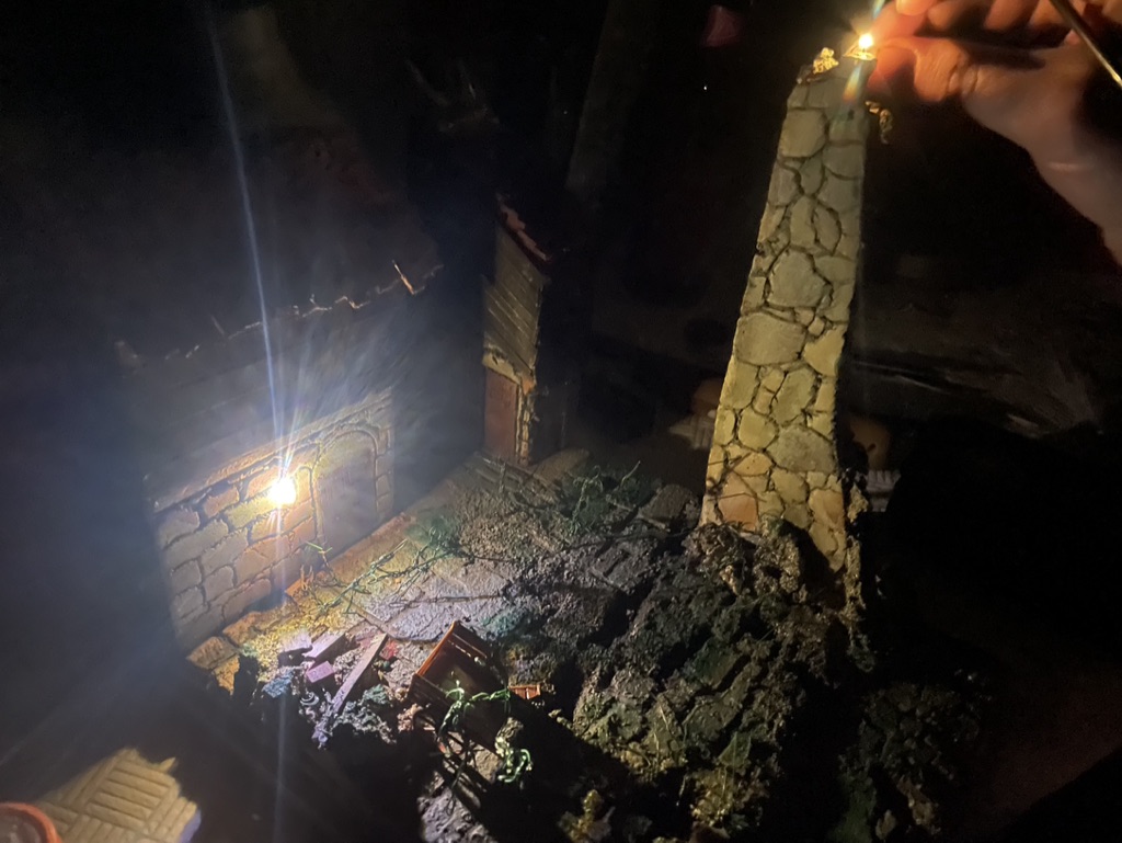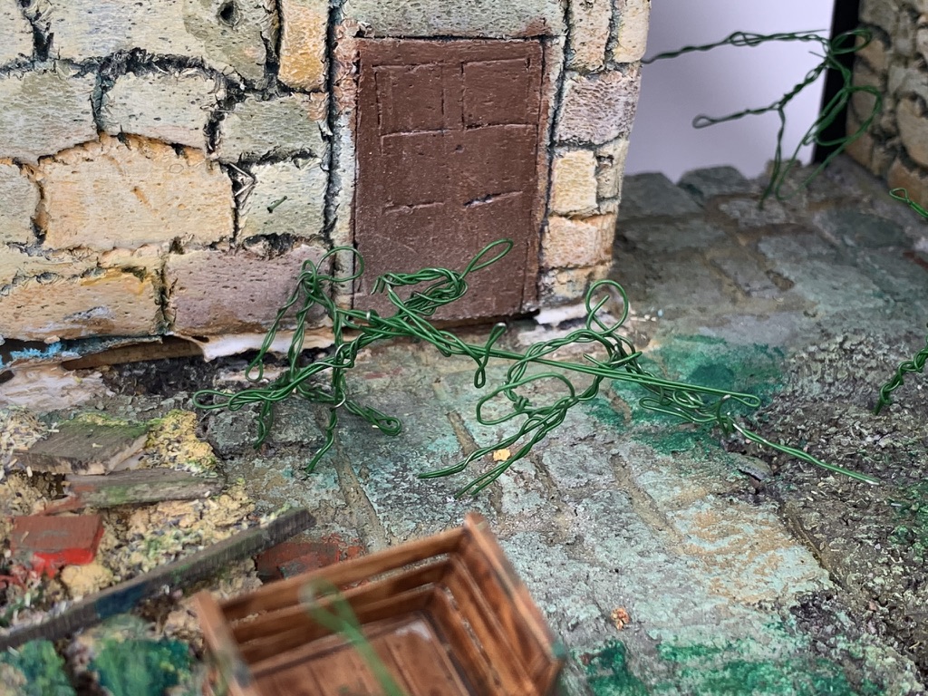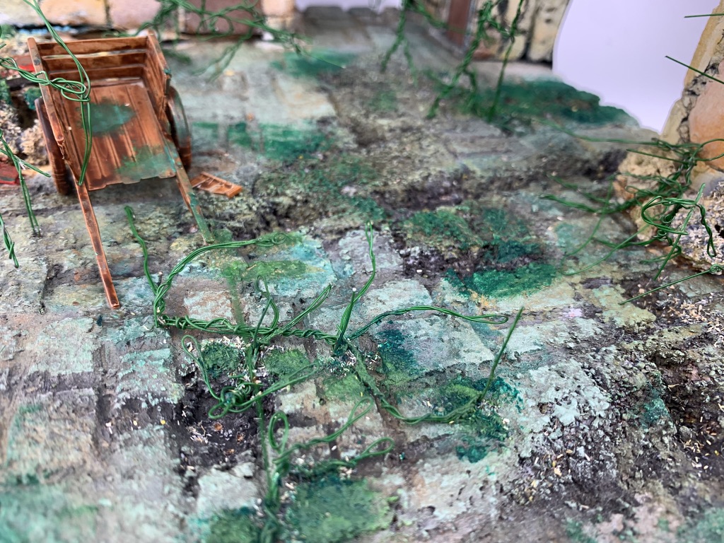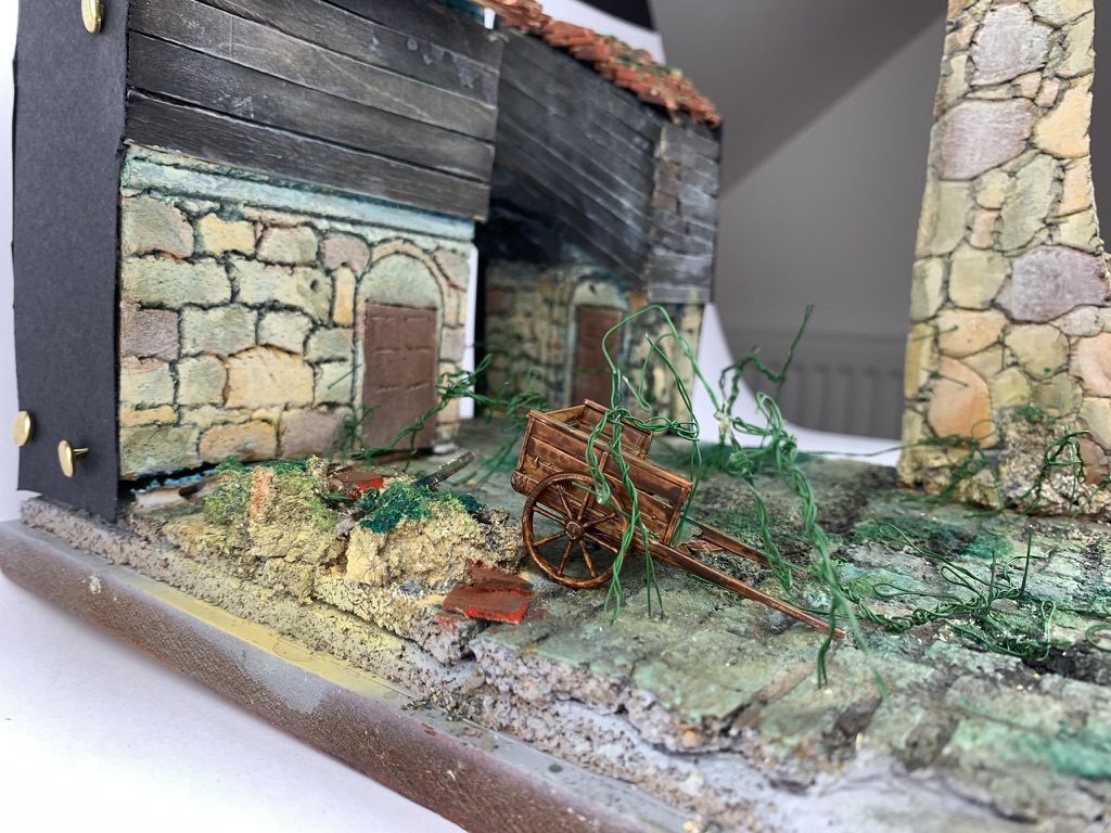 the juxtaposition of a realistic bass/background and more posable and harder to form emotive and active forms of wire armatures, the war torn look of the streat adds to the atmosphere of bleak chaos.