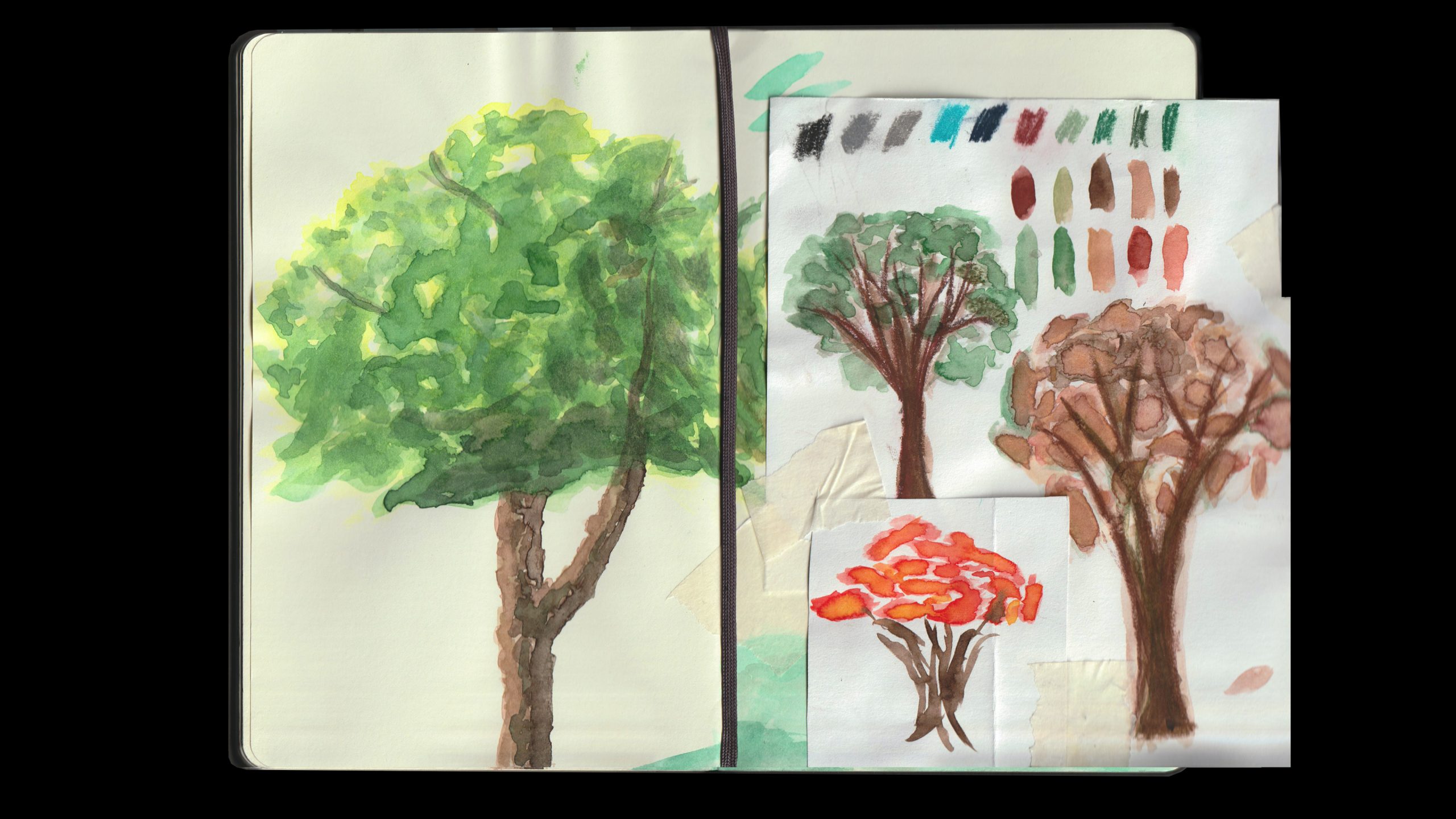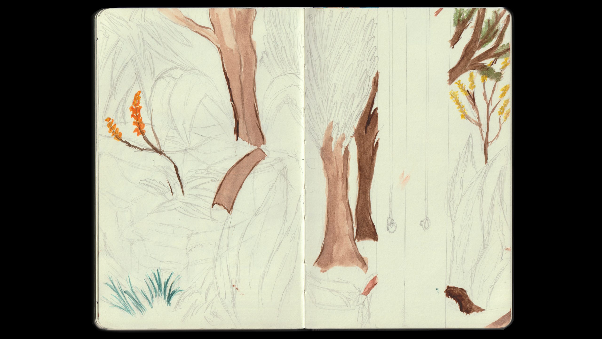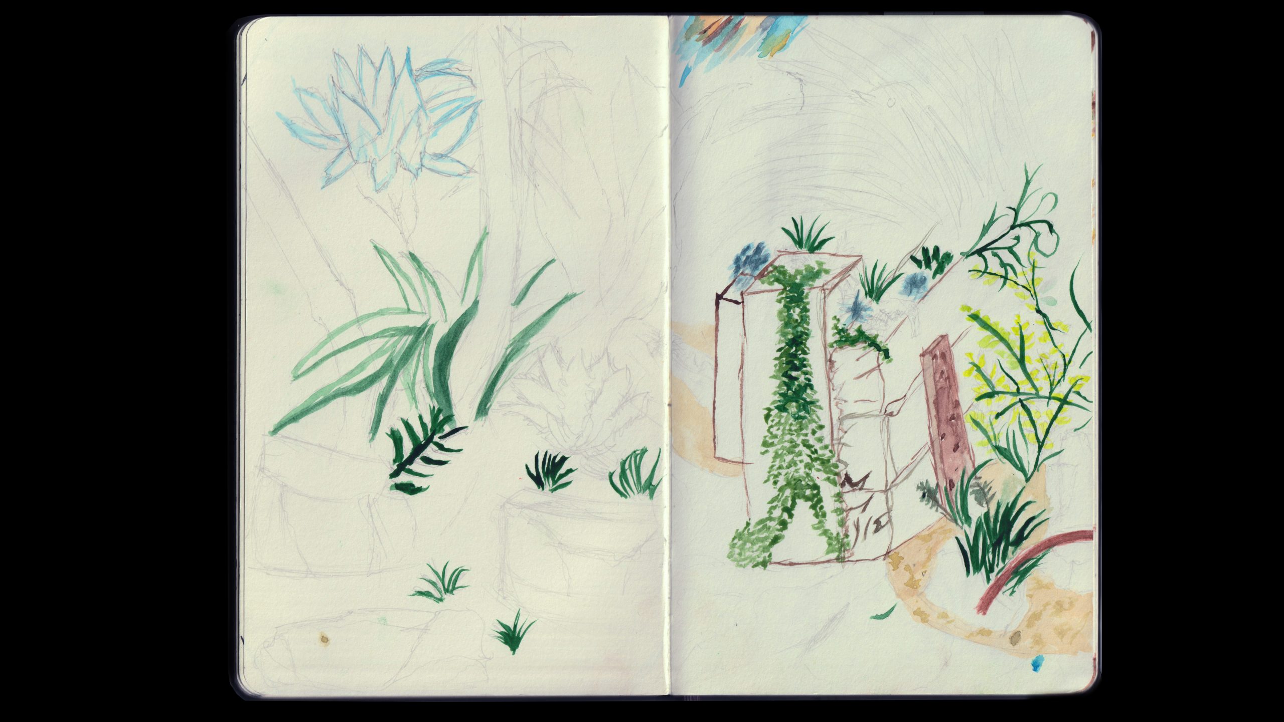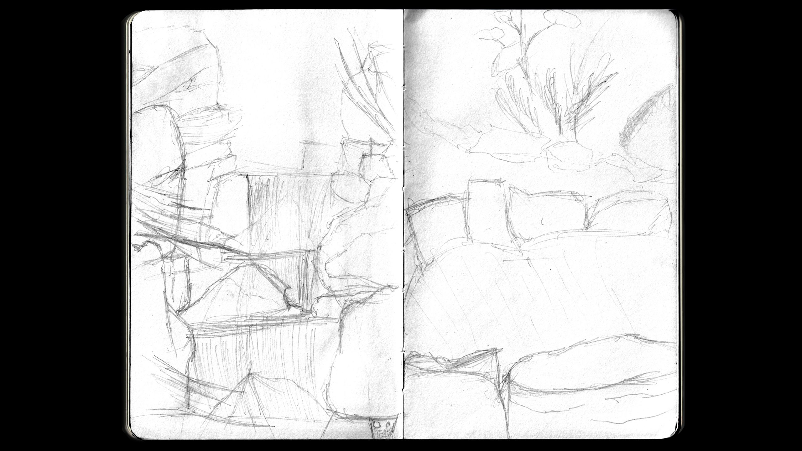 A few sketches of a system of waterfalls and ponds from various angles at RHS Wisley.