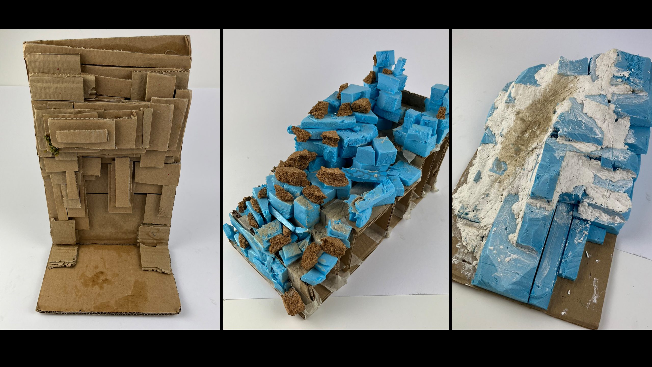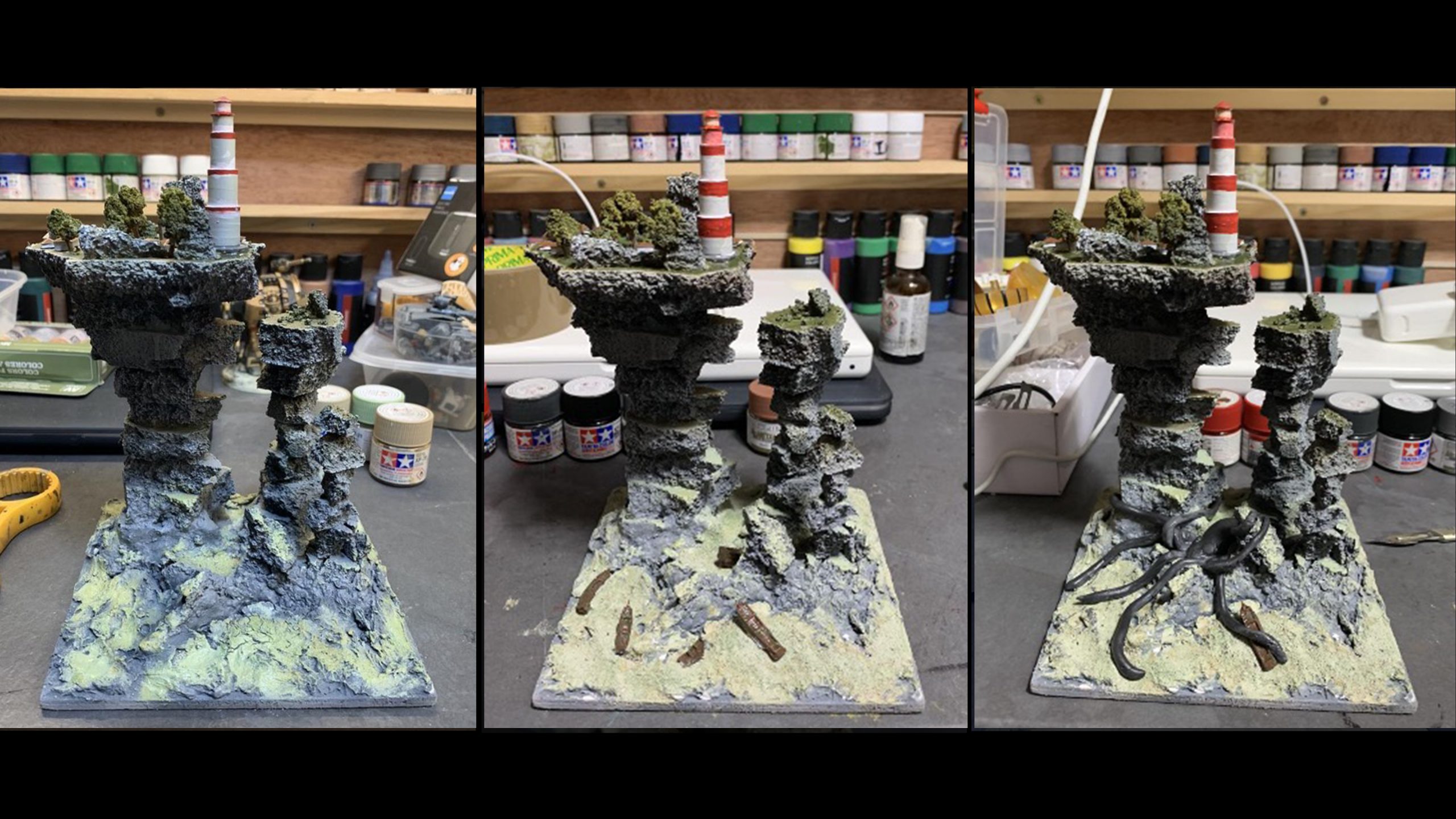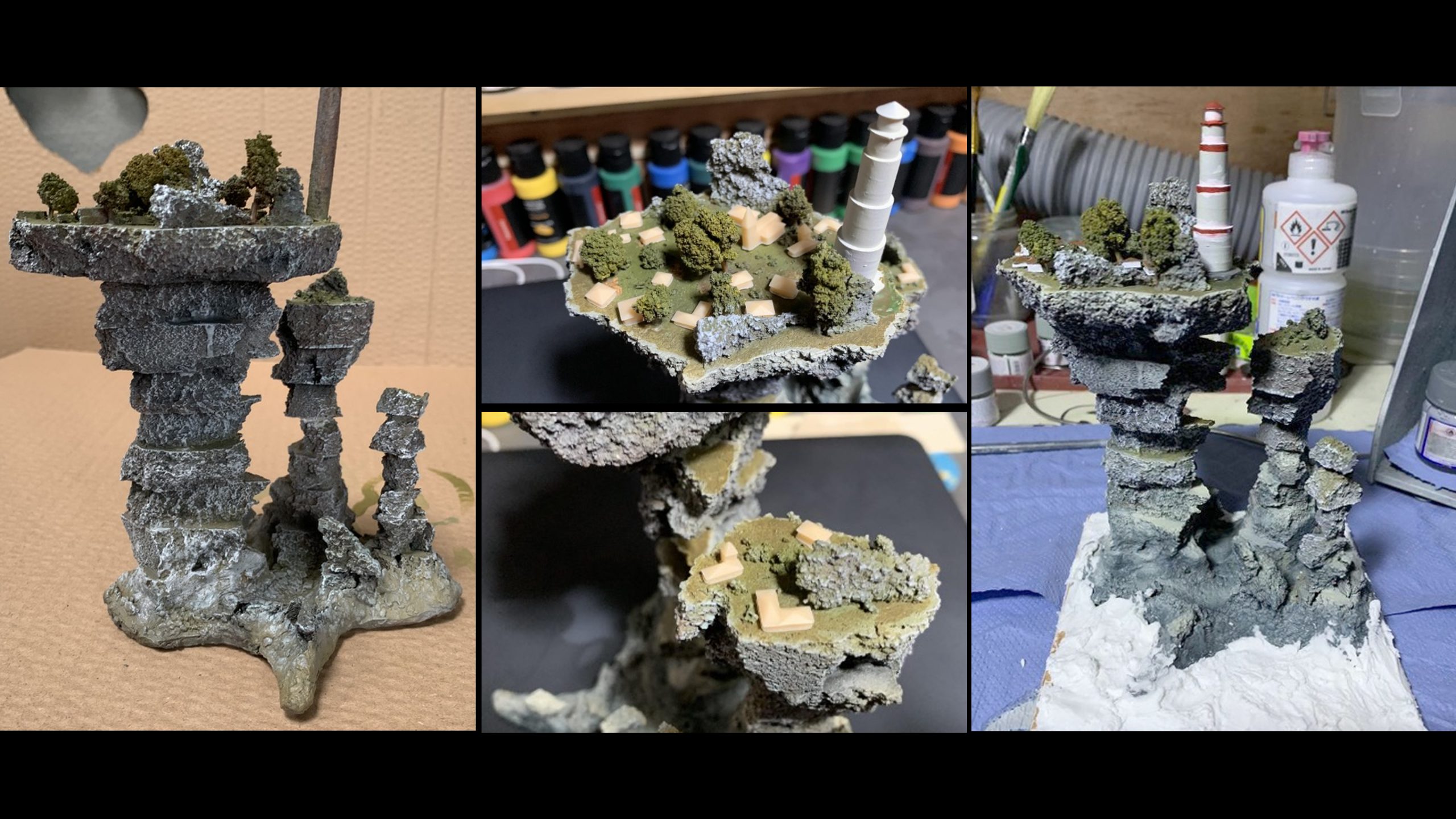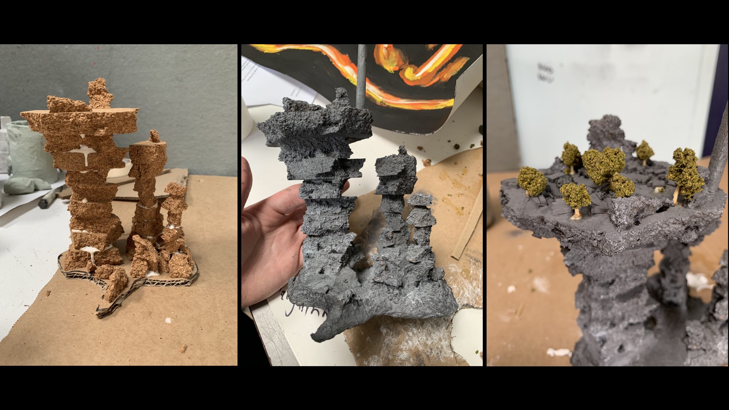 I usually start with general research or have already seen something interesting that I want to emulate or apply. Usually, I get my ideas from almost any source, for example, architecture, cartography, films, Pinterest and my primary interests, as it allows me to find an astonishing amount of amateur works and astounding art/ideas from various hobbies or small-time artists. This tends to be incredibly useful if you need to get into the flow of things again. I usually lack a set plan; thus, I typically let my materials inspire me, so I find a material or style and try to expand on it, as with the cork sea stacks, as seen below.