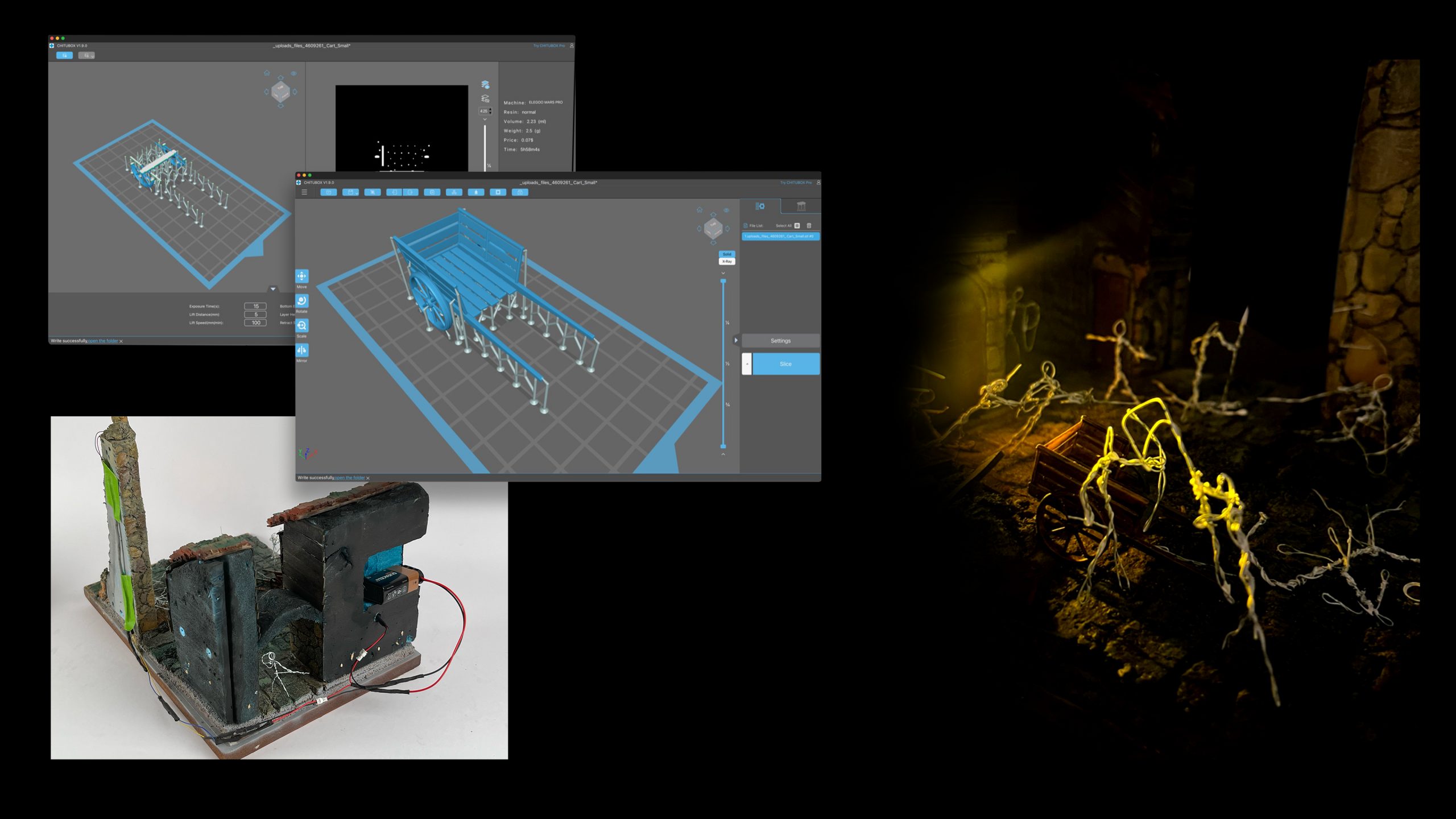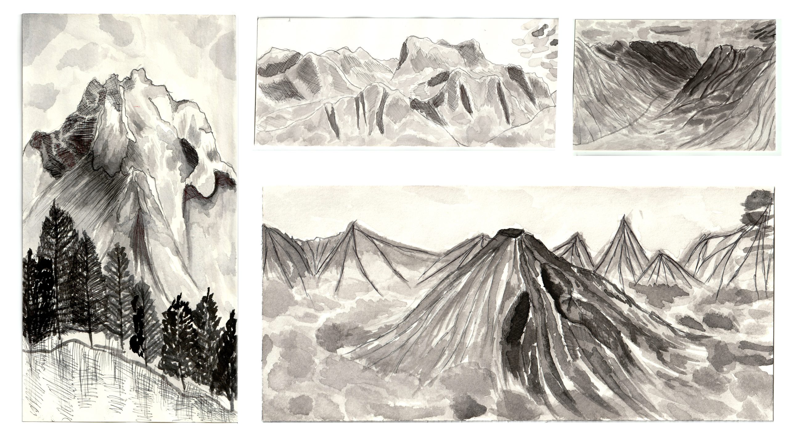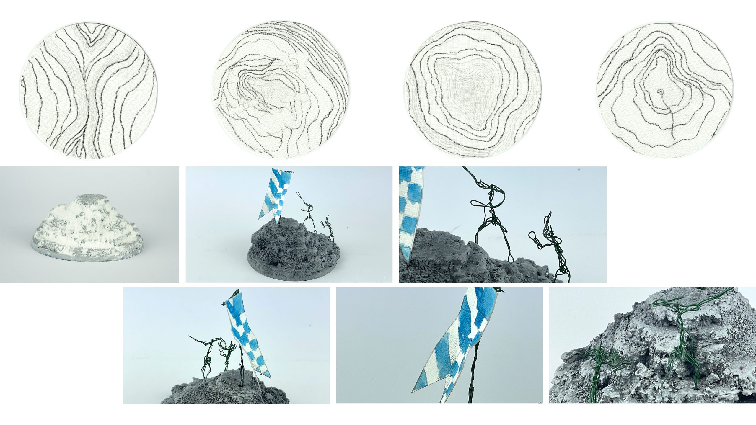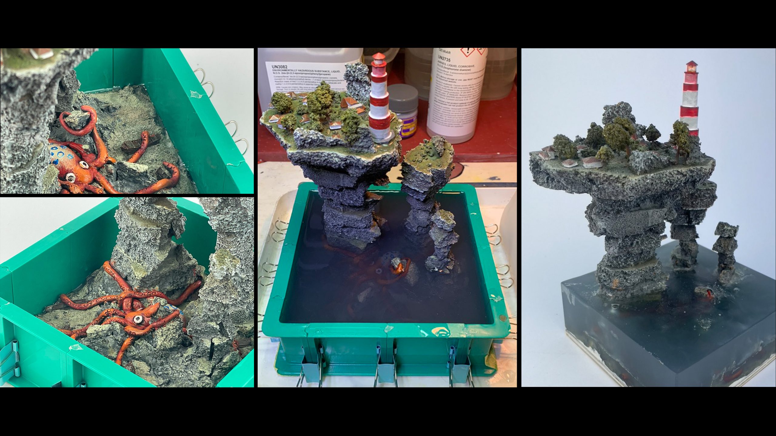 I usually start with general research or have already seen something interesting that I want to emulate or apply. Usually, I get my ideas from almost any source, for example, architecture, cartography, films, Pinterest and my primary interests, as it allows me to find an astonishing amount of amateur works and astounding art/ideas from various hobbies or small-time artists. This tends to be incredibly useful if you need to get into the flow of things again. I usually lack a set plan; thus, I typically let my materials inspire me, so I find a material or style and try to expand on it, as with the cork sea stacks, as seen below.